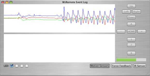 En tu Mac, asegúrese de que Bluetooth esté activado. Encienda un WiiMote (Asegúrese de que hay baterías en él!) y abrir una copia de DarwiinRemote. En tu WiiMote, pulse simultáneamente los botones 1 y 2. Agitar el WiiMote y entonces debe ver tres líneas (verde, rojo y azul) moviéndose arriba y abajo.