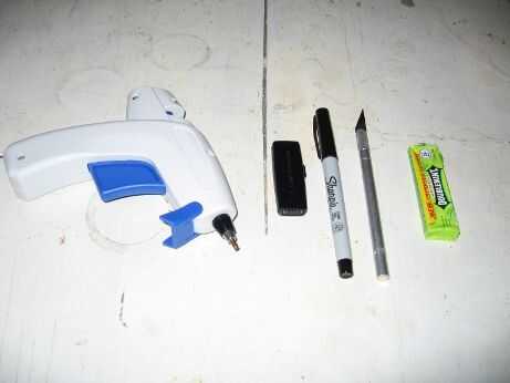 Lo primero es lo primero. Se reúnen todas las herramientas y suministros necesarios. Los siguientes son necesarios: caliente pistola de goma, llave de tamaño adecuado (yo usé un 16 GB Kingston DataTraveler 100), una pluma Sharpie punto fino, un cuchillo x-acto y un paquete de goma de mascar de Wrigley's Doublemint. Opcionalmente podría ayudar una regla o algún otro borde recto. Encontré el palillo de la goma igual de efectivo.
