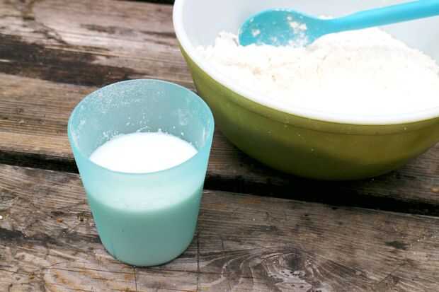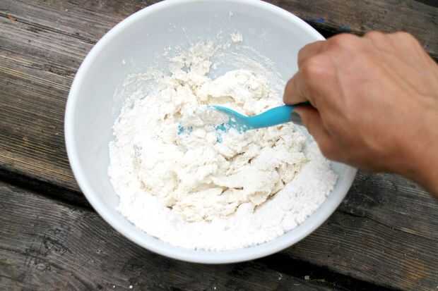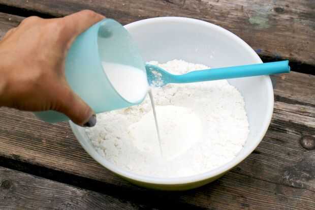 Mida la leche en la receta y añadirlo lentamente a la mezcla, revolviendo a medida que avanza. Descarga toda la leche en una vez. Sólo sigue añadiendo poco a poco hasta que la masa lleva a cabo juntas, pero no demasiado pegajosa. Demasiado pegajosa será igual a manos muy pastosas en lugar de manos sólo ligeramente pastosas.