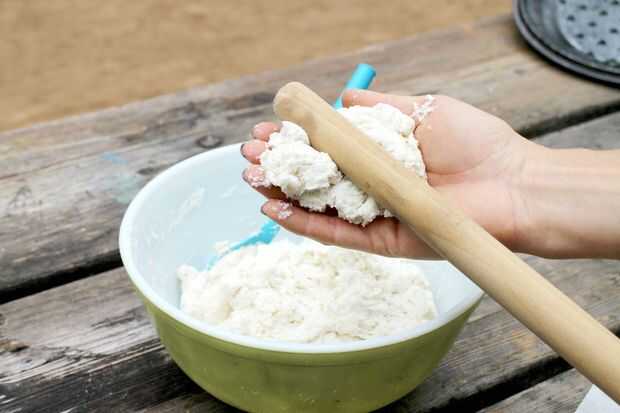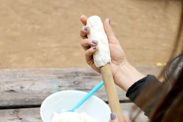 Sacar un puñado de masa y formar alrededor del extremo redondeado de la espiga. La más fina la masa, más rápido y más uniformemente se cocinan, así que dispara para un masa '' espesor de 3/16 - 1/4 ". También asegúrese de cubrir completamente el extremo del palillo (sin agujeros o brechas) por lo que al agregar la mantequilla y la mermelada una vez que esté cocido, no gotee hacia fuera *.