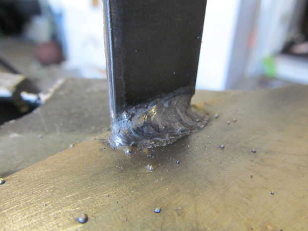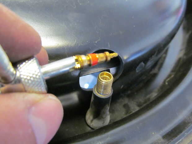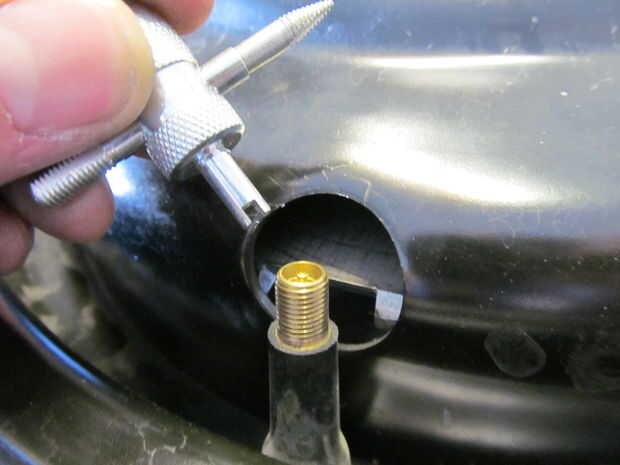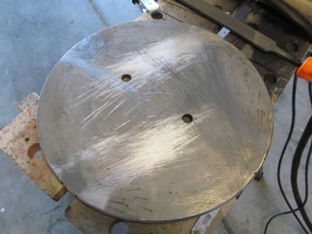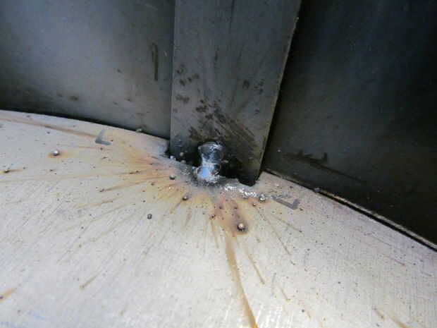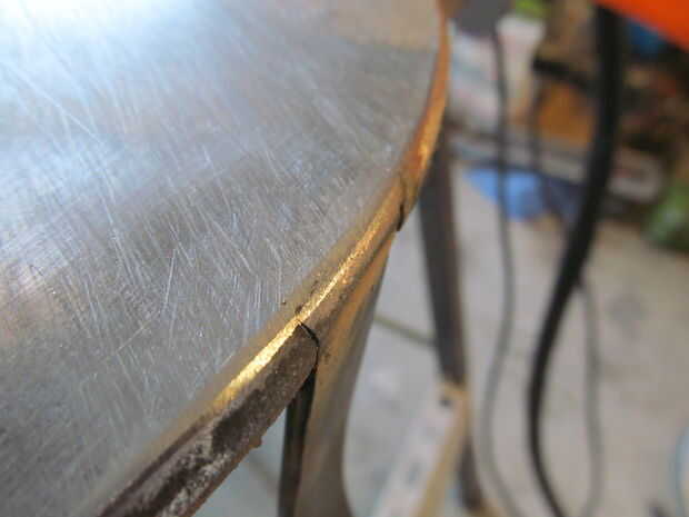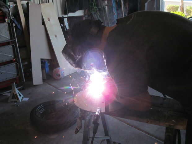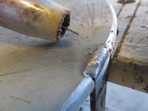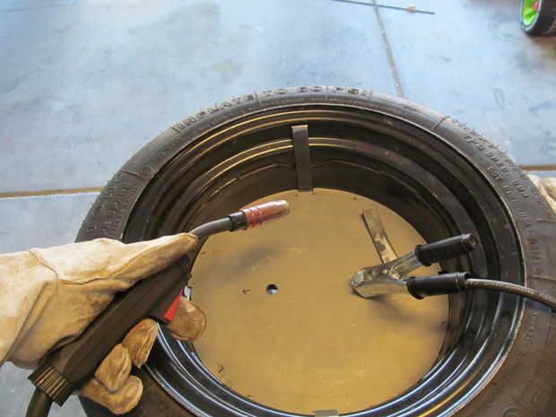 Quité el vástago de la válvula de la llanta permite para cualquier expansión de aire. Lo último que quería era un explosión de neumático. Una vez la soldadura de tachuela en su lugar he quitado la placa fuera de la llanta e hizo un cordón sólido en cada apoyo. A continuación, soldado con autógena de la parte inferior y presentó cada grano al ras.