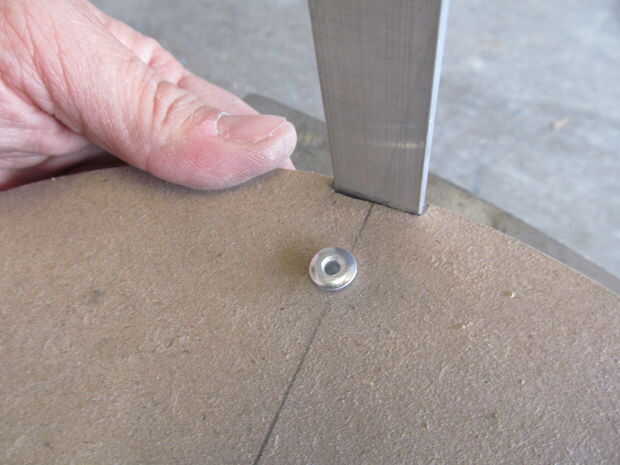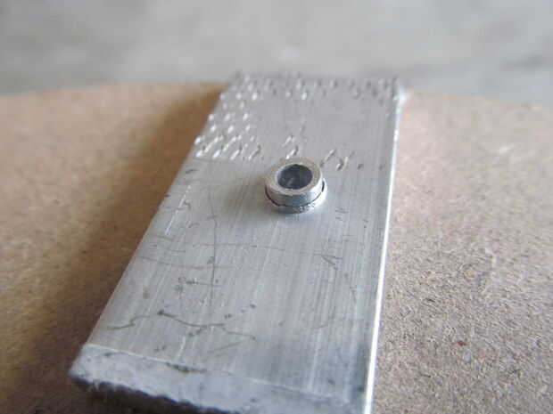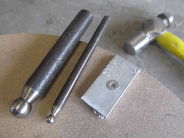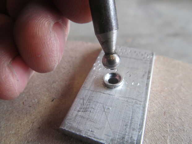 Antes les tenía que perforar. No es necesario colocar exactamente cada agujero. Como mantener cada apoyo en el mismo lugar usted perforados, se alinean muy bien. Normalmente utilizo una pistola de remache pero la mía es roto por el momento usé golpes de bola. Un calibre más pequeño comenzó la llamarada y más grande había ampliado plana. Para acabar martillado con martillo de bola.