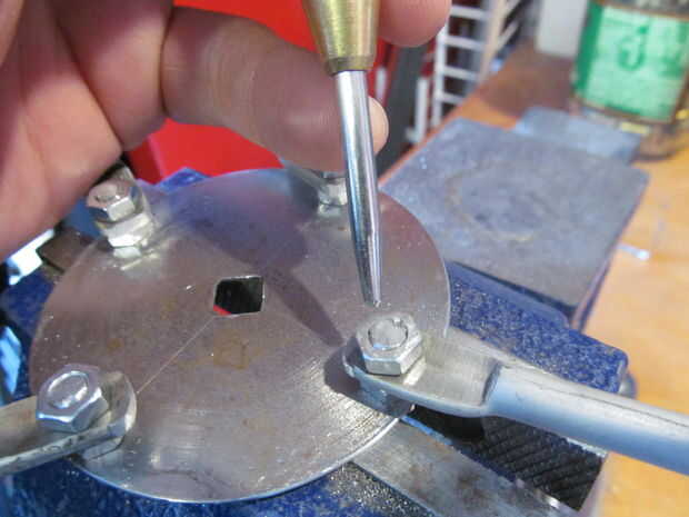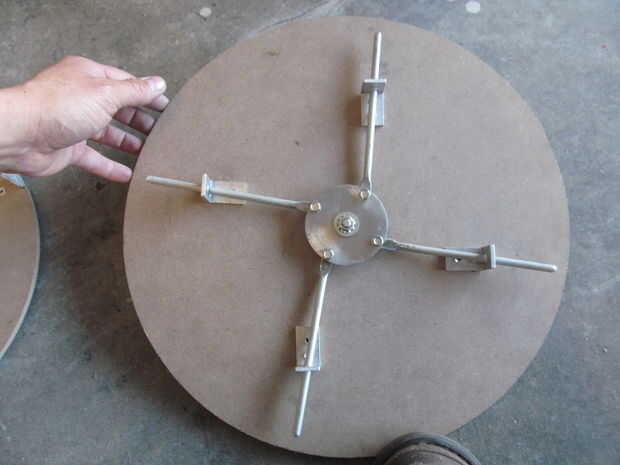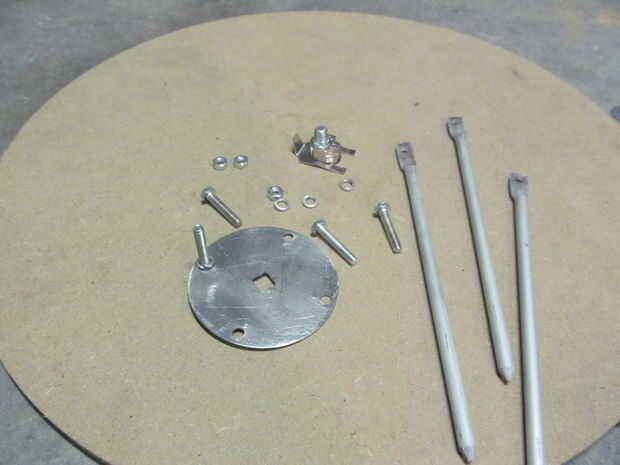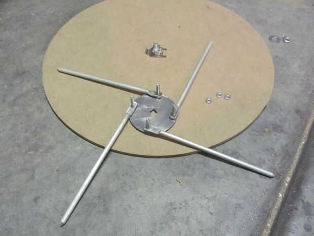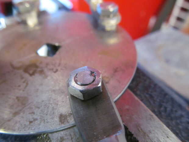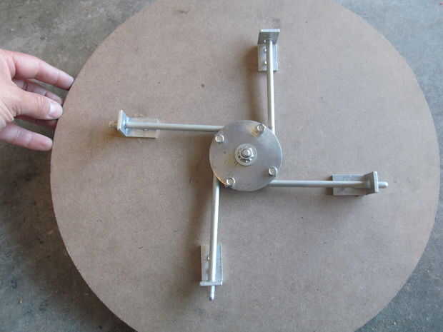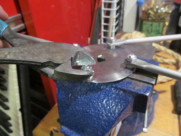Ingeniárselas fijar los pasadores al disco del centro no era demasiado malo. Al principio puse los tornillos a través de cada pin y había unido al disco con una sola tuerca. Esa configuración permite demasiado juego, dejándolos tambaleante. Para solucionarlo he montado los tornillos con una tuerca y se montaron los pines por separado con el otro.