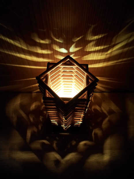 Hice esta lámpara "jugando" con espigas de madera y me ha encantado hacerlo. Son infinitas las formas y geometrías que se pueden crear con cosas como tacos (¡ o casi!) así que siempre es muy divertido para mí tratar de crear otros nuevos. Pero la parte que me gusta más está poniendo la luz en él para ver los efectos de luz mágicos que crearon esas formas. Siempre me sorprende cuán hermosos son, incluso cuando las formas son tan simples!