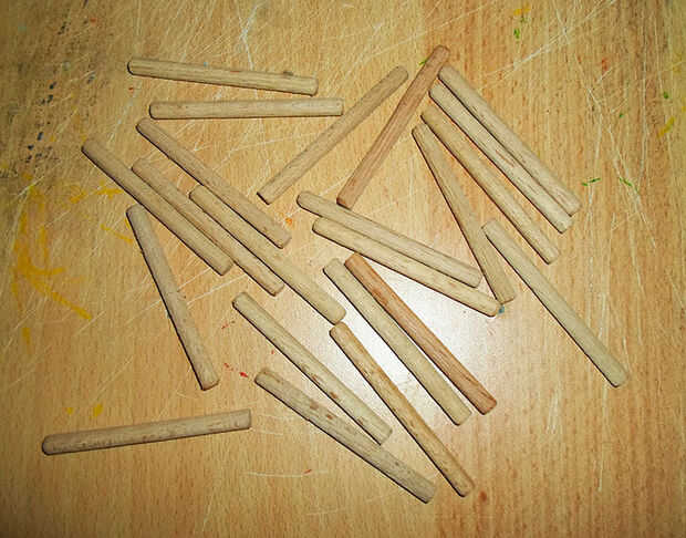 • clavijas de madera 124 - mina son aproximadamente 7cm (2,75 pulgadas) largo con un diámetro de 5mm (0,19 pulgadas), usted puede conseguirlos aquí.