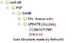 Descomprimir en escritorio. Ahora toma al 6.39 Downgrader y ponerlo en PSP/GAME y poner el update 6.20 EBOOT en PSP, juego o actualizar. También dice 6.39 pero todavía funciona en los demás. Ahora coloque el PRO UPDATE (CFW) en PSP/GAME también. Pero si desea permanente psp cfw, entonces pone un permanente en PSP/Game también.