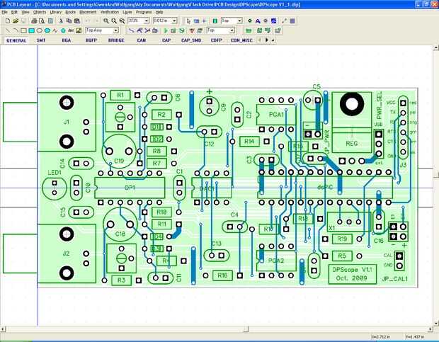 A continuación se muestra el diseño final. Puedes ver que puse los componentes en un orden lógico: A la izquierda, cerca de los conectores BNC de sonda, es de los circuitos de entrada (atenuador, amplificador de entrada, diodos clampd, compensación de la sonda). En el medio es el desplazamiento de DAC y los amplificadores de ganancia programable, seguidor por el microcontrolador dsPIC. A la derecha por último tienes el conector del cable USB y la fuente de alimentación. Todas las fichas se colocan en la misma orientación (pin 1 es de abajo a la izquierda, queda la muesca) para minimizar la posibilidad de errores de montaje.