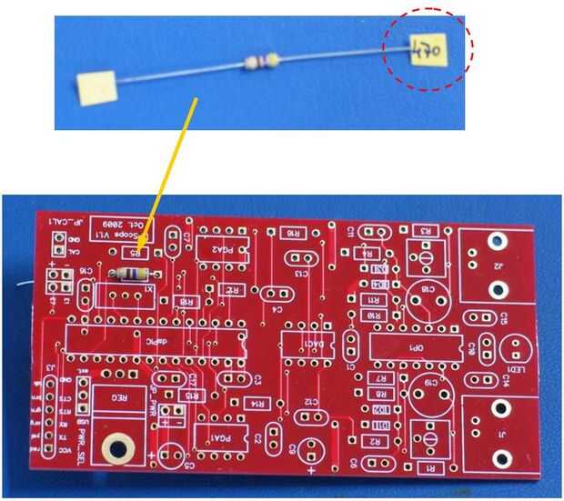 Vamos a comenzar con algo simple – resistencia R19, que cuenta con 470 Ohm. Todas las piezas se consigue montadas de una manera muy similar. Encontrar la resistencia de entre todas las partes – está etiquetado con "470" (ver imagen abajo). Localizar el contorno de la componente con la etiqueta "R19" en la placa de circuito impreso (PCB). Doblar los cables del resistor y péguelos a través de la Junta. A continuación se muestra el resultado final.