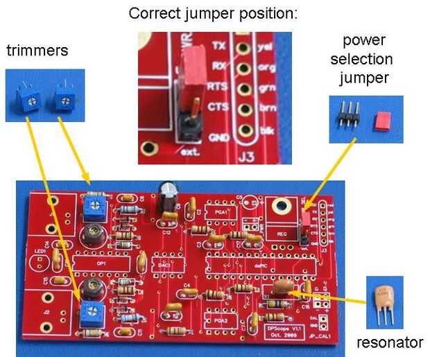 Quedan unos cuantos más pequeños componentes: los dos trimmers (VR1 y VR2, los bloques azules con la perilla de ajuste en la parte superior), el resonador de cerámica (X1) y el puente de selección de energía (PWR_SEL). Instale como se muestra a continuación y poner el bloque rojo de cortocircuito en el jumper en la posición indicada en la imagen ampliada (con la etiqueta "USB"); Este puente se utiliza para seleccionar el regulador de voltaje y fuente de alimentación externa opcional como fuente de energía de alcance; por defecto estos no se instalan porque el instrumento obtiene su poder a través de la conexión USB.