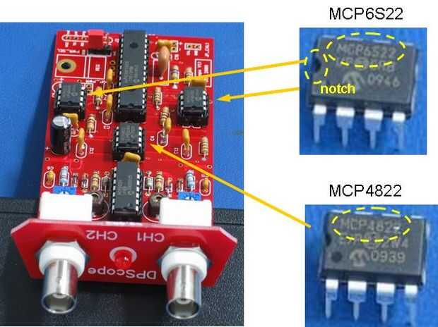 Nota 2: hay dos tipos diferentes de las ICs de 8 pines – Asegúrese de que usted instalarlas en las ubicaciones correctas como se muestra en la imagen siguiente. Instalación en el lugar equivocado (o en la orientación incorrecta) se destruyen cuando usted encienda el osciloscopio. Se pueden distinguir las fichas con las etiquetas impresas en ellas (dos están etiquetados como MCP6S22, uno es con la etiqueta MCP4822).
