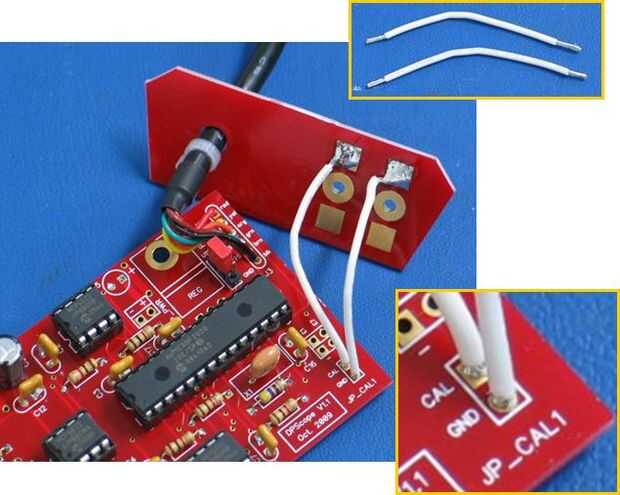 Tome los cables de dos y les de la soldadura en la Junta y en las almohadillas de soldadura en el backpanel como se muestra. Asegúrese de conectar el agujero marcado "CAL" con la almohadilla del backpanel va en el agujero «CAL» en el backpanel y lo mismo para "GND".