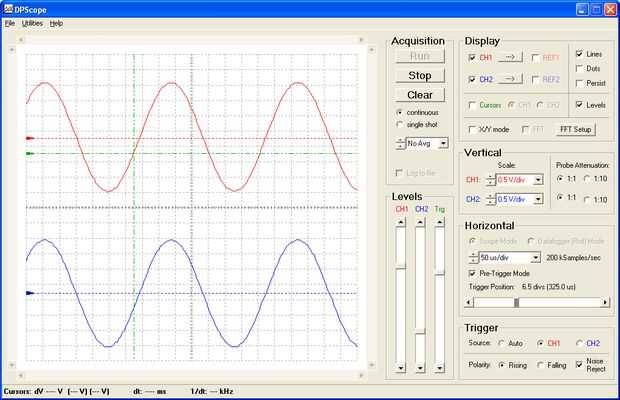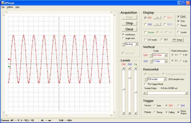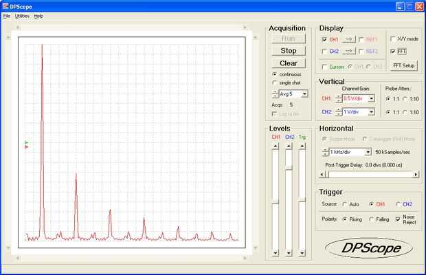 Una función es el FFT (frecuencia) pantalla - en este modo el software realiza un en tiempo real Fast Forreo Transformarse (FFT) de datos, tal ves el espectro de frecuencias de las señales. Esto es una gran herramienta por ejemplo, para localizar un ruido periódico pequeño que sería difícil ver en la pantalla de alcance normal y también a adquirir una sensación intuitiva para el dominio de la frecuencia.