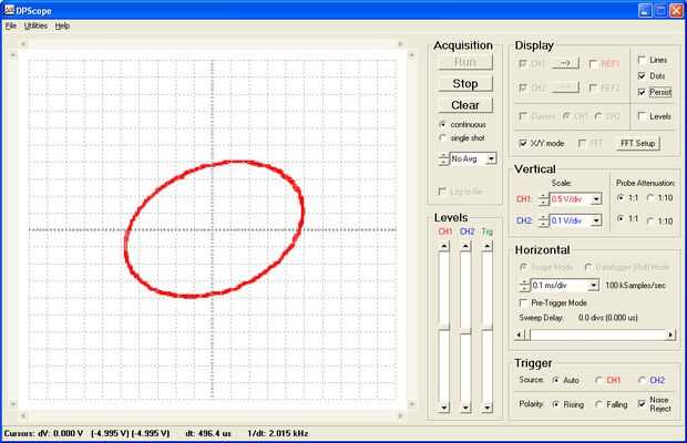 Otro modo es el modo X-Y donde se trama una señal frente a la otra (en lugar de ambas señales versus tiempo). Esto permite la rápida caracterización de componentes y cambios de fase.