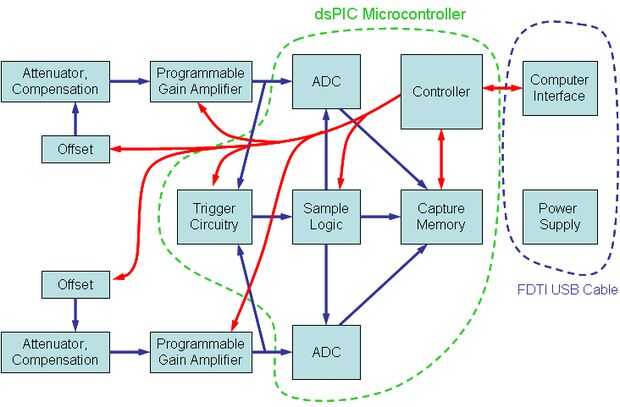 Como se puede ver, el microcontrolador dsPIC30F2020 permite implementar la mayoría de él sin circuitería externa - controlador, memoria, lógica de la muestra, convertidor de analógico a digital (ADC), el disparador y el gatillo todos residen en un único chip de control de nivel. Esto hace el diseño muy compacto, barato y fácil de construir.