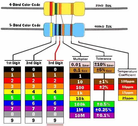 Utilizado en el kit con 1% de tolerancia de resistores tienen 5 bandas de colores (3 dígitos, un multiplicador, una tolerancia).