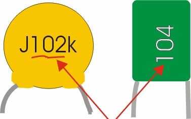 El valor es dado en pF como un número de 3 dígitos "xxy", compuesto por 2 dígitos significativos (xx) y un multiplicador (y). Las marcas pueden estar pequeñas para leer ellos utilizan una lupa si es necesario. A veces hay sólo un dígito o dos dígitos, este da entonces la capacidad en pF directamente. Letras (J, K,...) denotan las tolerancias etc., para nuestros propósitos aquí simplemente ignoran tem (es decir, "k" no significa "kilo"!).