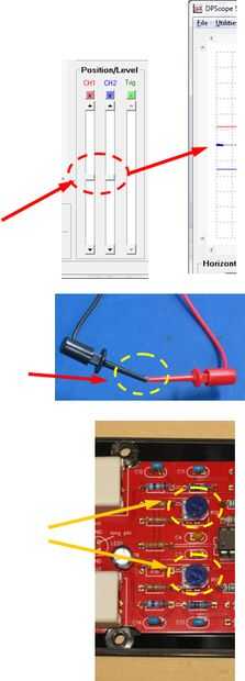 Ajuste los dos trimmers (R12 y R13) moverá el rastro respectivo (rojo = azul y CH1 = CH2) hacia arriba y hacia abajo.