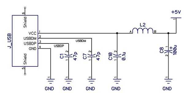 Hay algunos fuente de potencia mínima disociación – condensador electrolítico a granel C8 en combinación con cuña L2 y el condensador de cerámica de C10 filtrar la alimentación USB: C8 actúa como un amortiguador (depósito) para cuidar de sobrecargas en los circuitos de consumo de energía. C10 y L2 bloquean ruido de alta frecuencia desde el PC al alcance o disturbios provenientes del ámbito de aplicación.