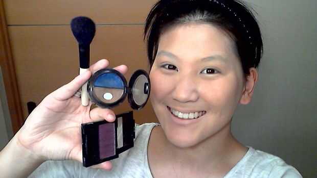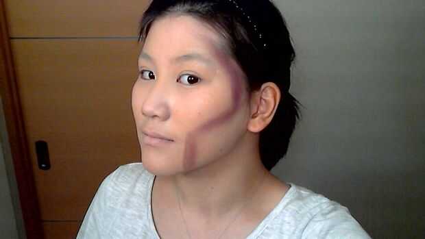 Tomar un mate marrón y morado (no fotografiada pero más tarde usé un poco de negro mate para profundizar mis huecos de la mejilla) y hacer exactamente lo que hice en mi segunda foto. De una pulgada a la esquina de mi movimiento de labios hacia abajo y de esa misma esquina en marcha punto trazo hacia el oído. Luego hacen una "patilla" y dejar un poco más allá de sus templos.