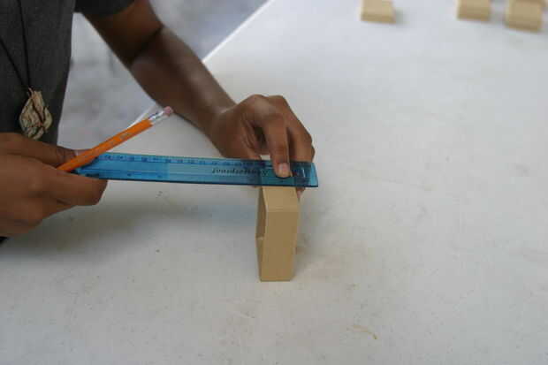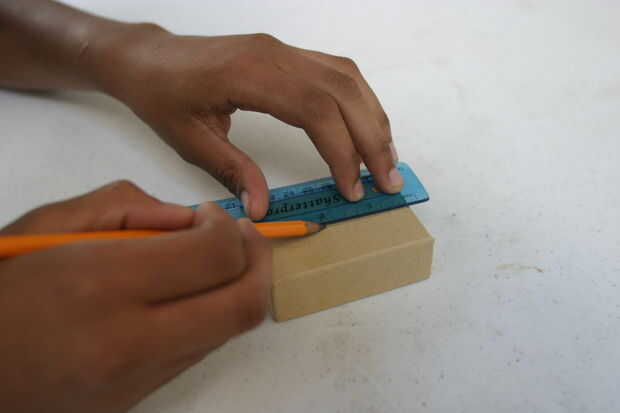 Utilizando la regla y el lápiz, dibujar líneas maneras de largo en 4 de los fondos de caja. Es muy importante trazar las líneas rectas, porque se cortan a lo largo de estas líneas más adelante para formar brazos y piernas de la marioneta.