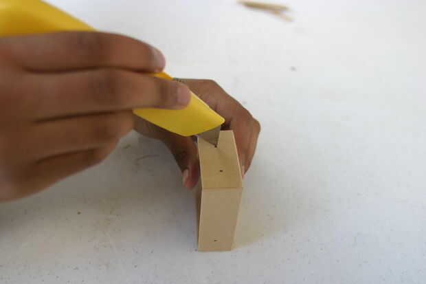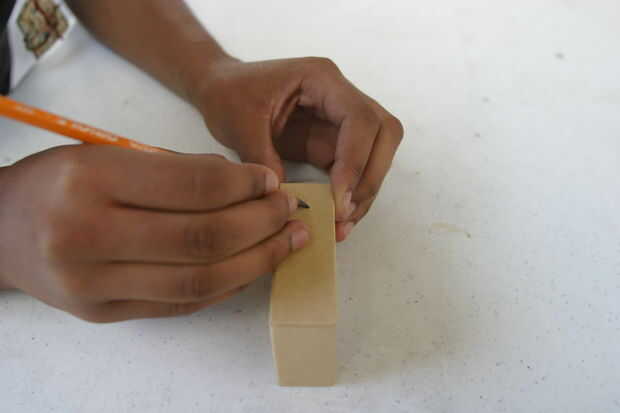 Con el lápiz marcar 5 puntos en otra parte inferior de la caja. Este cuadro será el torso de la marioneta. Hacer una marca en la parte superior, dos en la parte inferior y en cada uno de los lados. Con sus tijeras o el cúter, poke agujeros en cada marca. Consulte las fotos de abajo.