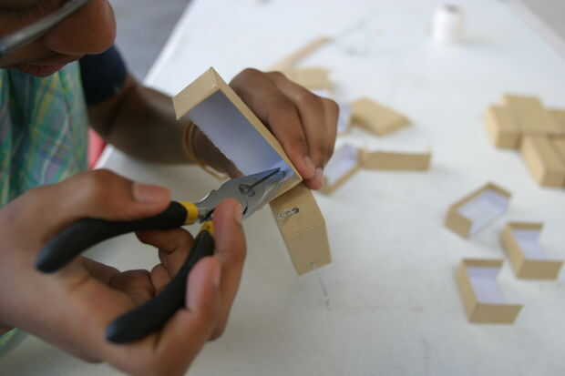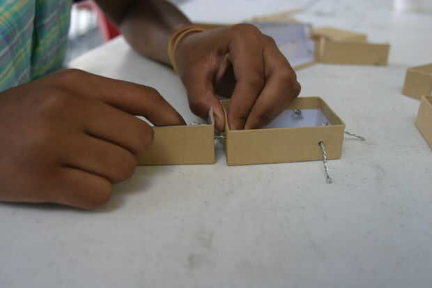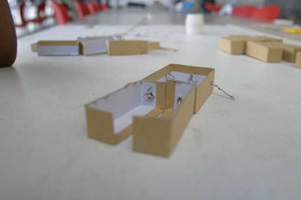 Siguiente tomar los fondos de dos caja que trocea mucho flaco (en los pasos 2 y 3) antes y empujar los agujeros en un extremo de cada caja. Conexión de estos "miembro" a la caja de tronco tomando los extremos sueltos de los cables y ponerlos a través de estos agujeros nuevos. Repetir el paso 6, doblar los extremos del cable dentro de las cajas de la extremidad con los alicates, para conectar bien las piernas y los brazos al torso.