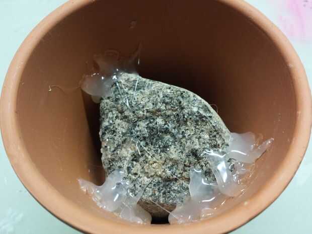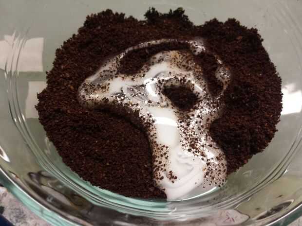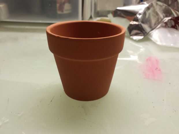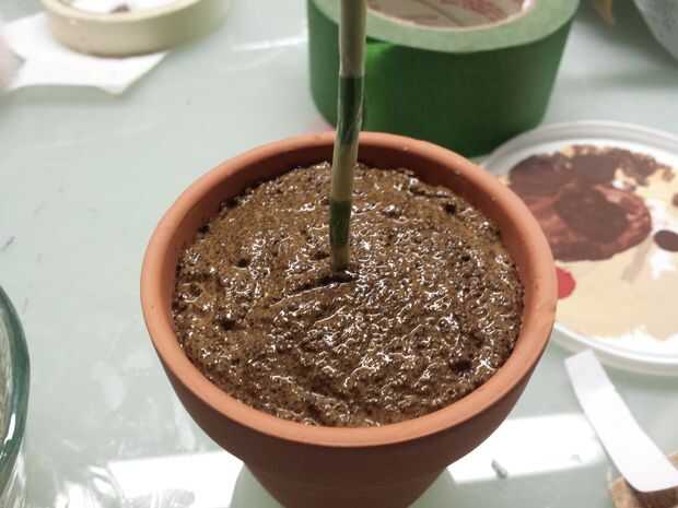 5. mezclar pegamento blanco en el poso del café y poner en el bote. Tenga cuidado de no obtener el café molido en el borde de la maceta. Esto probablemente tomará un día se seque por completo.