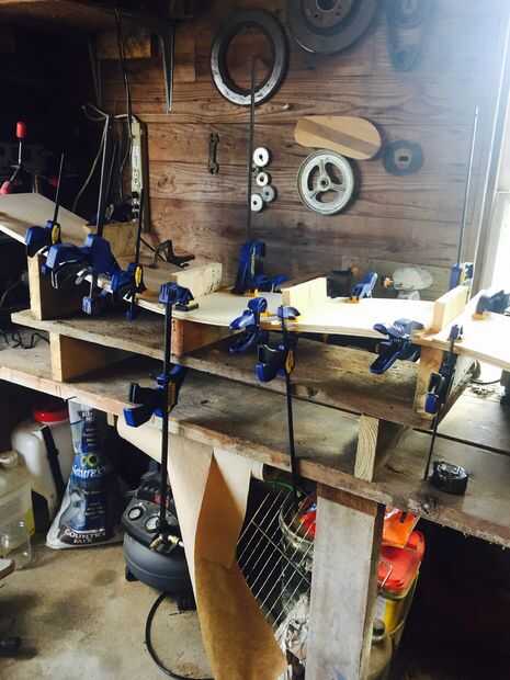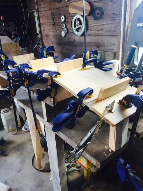 Cuando la forma estaba lista me puso la primera hoja del formulario y coved con el pegamento. Necesita un montón de cola para madera para este proyecto, me compre el 32oz botella y me alegro de que lo hice. Una vez que la hoja estaba cubierta con el pegamento me puse la siguiente hoja. Asegúrese de que sus lados estén al ras para que no tenga que lijar al ras después.