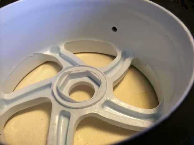 Utilizando una Dremel he limpiado la parte interior de las ruedas. Este proceso asegura una mejor adherencia del adaptador de la rueda y elimina las imperfecciones del plástico.