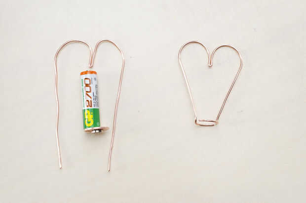 Ahora puede doblar en forma de un corazón del cable pelado con la herramienta de desmontaje, que le da la parte superior del corazón. Tomar la batería, poner la moneda de cobre por debajo y luego el pequeño imán.