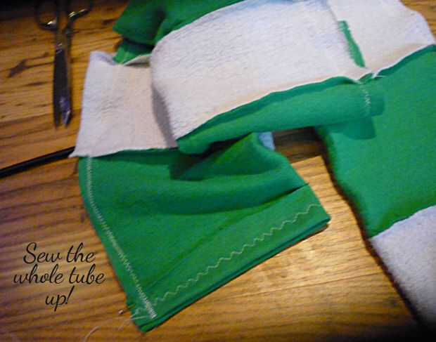 Esto resultará en un pedazo largo rayado de tela con las costuras en el interior. Dobladillo en ambos extremos.