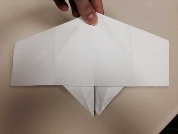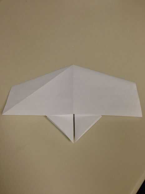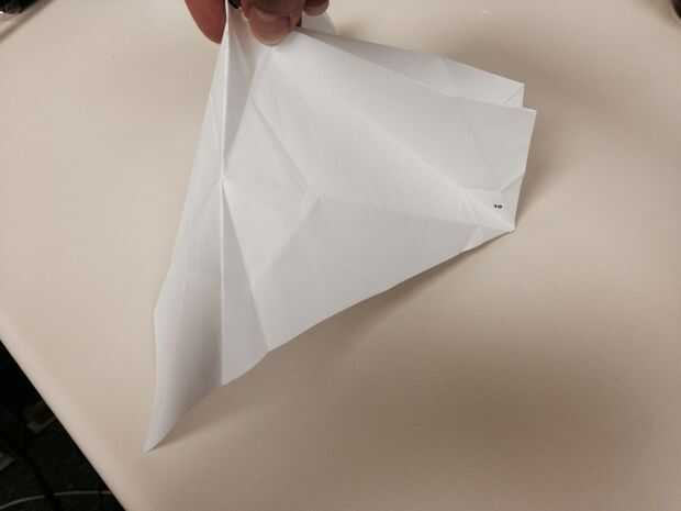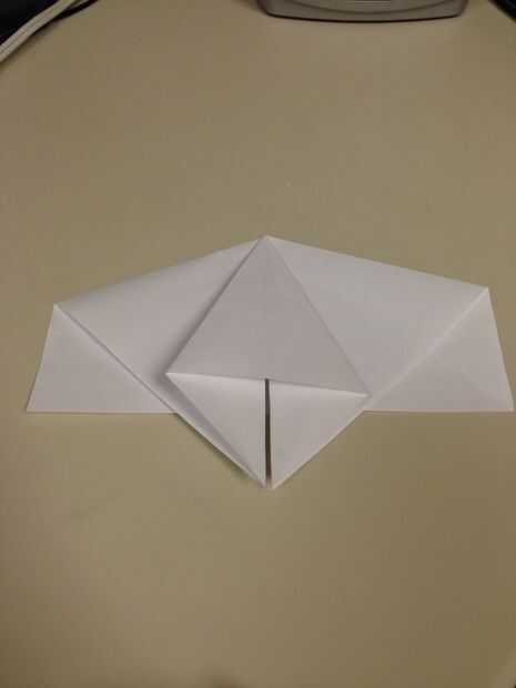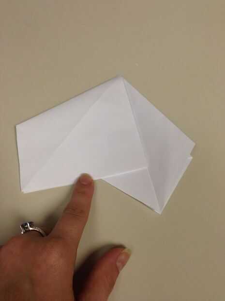 Luego, otro más difícil parte, empuje el centro del rectángulo hacia abajo y en la parte delantera de la forma. Gire el triángulo hacia abajo y empuje plana. Dan la vuelta y asegúrese de que las "patas" estén en cada lado. Debería verse como la última imagen.