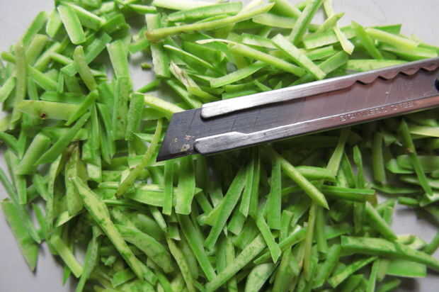El método de los cortes que he creado fue primero cortar la piel normal/perpendicular hasta el borde, aproximadamente 2mm en la superficie. Una vez que completado la red de cortes, entonces corté a aproximadamente 45 grados para el corte inicial, permitiendo las láminas delgadas de piel a depilar.