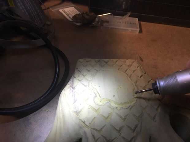 Si encuentras un buen elemento para embutido, podría ser una piedra, pedazo de metal, o hasta su imaginación. Si tiene un elemento, colóquelo en la parte superior, luego traza alrededor de él y utilizar una herramienta giratoria para empezar a tallar la forma. Arrancar dentro de sus líneas de dibujos y seguir tratando de volver a colocar el elemento. Desea firmemente así comienza hacia fuera pequeño y trabajo. Utilice un epoxy 2 parte al elemento de la cola en la abertura realizada. Tenga cuidado de no obtener en la superficie externa.