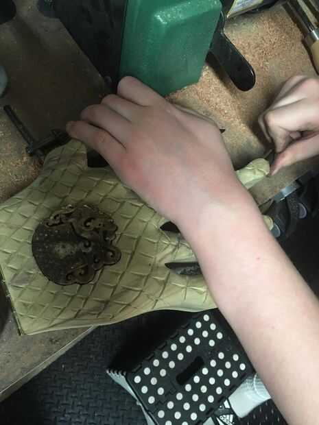 "Tesoro" en forma de Sierra de cinta estilo anillo de compromiso de la caja de Chechenia laminado y madera purpleheart. La "almohada" fue hecha de una pieza de espuma envuelta en un viejo bolso de las gafas de sol. El cuadro fue acabad