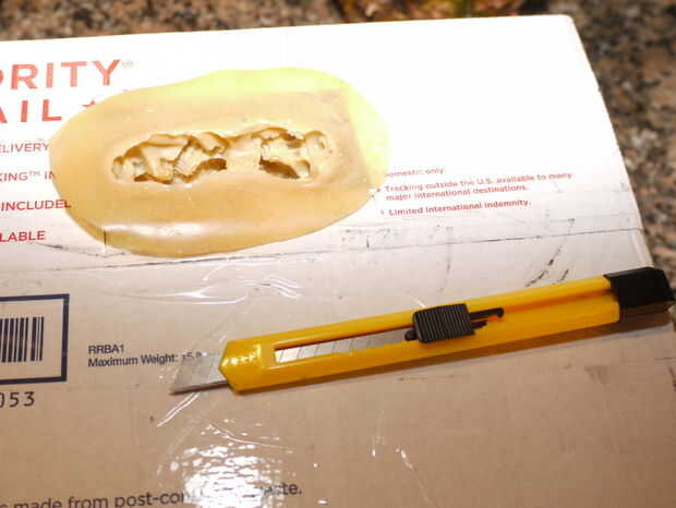 Antes de empezar a derretir la cera, corte un agujero en la parte superior de una caja de cartón para el molde a boca abajo. Poner en el molde, asegurándose de que la parte inferior es nivel.