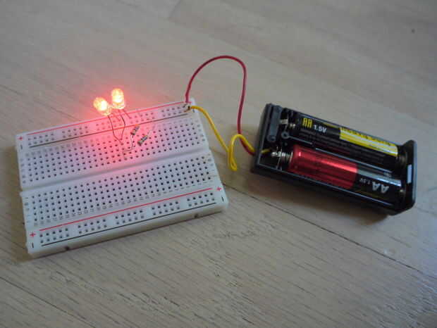 Tenía una caja de 2xAA conmutable de Radio Shack y algunos super brillante LED rojo. Las especificaciones en la página web del vendedor dieron la corriente y voltaje gota (también medí el último) que pongo en una aplicación de calculadora de LED para encontrar los valores de resistencia correspondientes a la caja de 3V. Puesto que mi tensión era más de la mitad de la tensión de alimentación, los LEDs se tuvieron que ir paralelo, y la calculadora llamada para una resistencia de solo 25 ohm conectado a los dos LEDs en paralelo. No tengo una resistencia de 25 ohm, por lo que acabo de poner dos 47 ohm los en paralelo para una resistencia eficaz 23,5 ohmios.