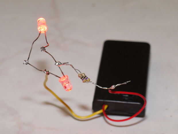 Soldar los LEDs en paralelo, largo pueda llevar mucho tiempo (positivo) y más corto a más corto plomo (negativo, también marcado por el plano en el borde de LED). Yo les soldadas perpendicularmente entre sí, como uno se va en el dragon y el otro en la parte inferior.