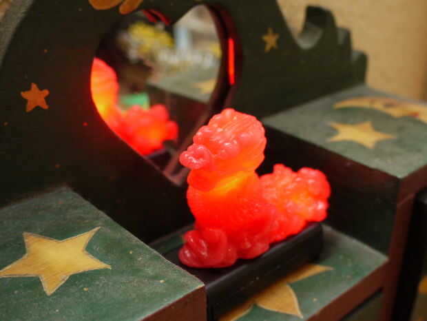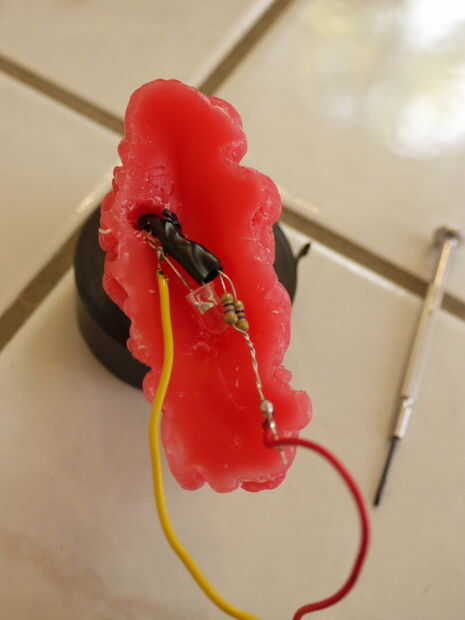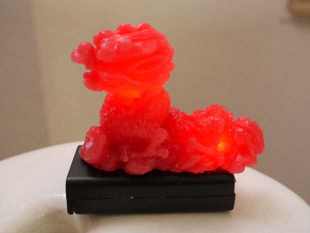 Relleno el LED en su agujero, empujando con un destornillador si es necesario. Puse otro LED en su depresión en la parte inferior. Agrandamiento de la depresión en la parte inferior del dragón para el cableado y había puesto el dragon encima de la caja de batería.