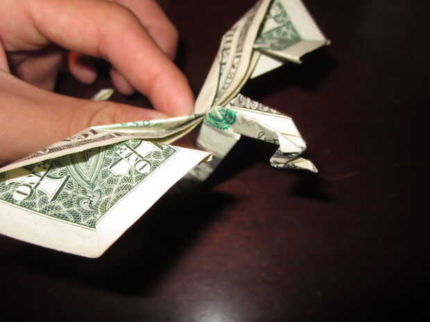 Puede utilizar pegamento o cinta para fijar las alas al cuerpo. La construcción del ala es doblada por la mitad, colocada dentro del cuerpo, después dobla hacia afuera donde la espalda del dragón con las alas.