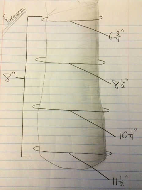 1. mide en cuatro lugares en mi antebrazo por lo que yo sabía lo ancho el guante tenía mientras estaba clavando juntos. Lo hice sin embargo, hacer el guante una media pulgadamás pequeña que las mediciones originales así que cuando lo pongo en mi brazo, el guantelete tendría doblando habitación, como se verá más adelante.