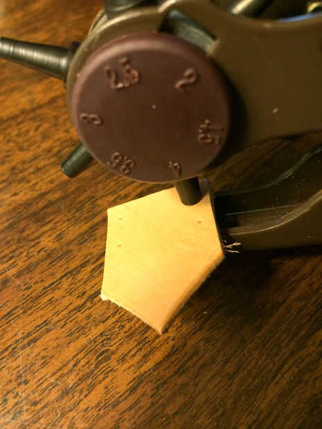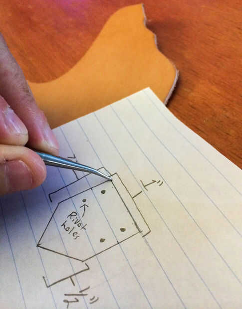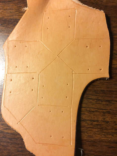 Tomé la escala a partir de anteriores y traza con el lápiz de cuero en cuero de chatarra. Después de cortar la escala, luego es cada uno de los cuatro orificios perfore. Configurar el punch de cuero en un 4 por lo que le daría una pequeña sala de meneo para el remache antes de los.