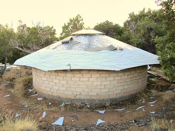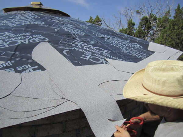Instalación de las tejas es una cuestión de colocar las tiras en superposición concéntrica anillos clavado abajo las tejas como vas. Es un poco de arte para obtener el patrón de los bordes ondulados se vea bien. Hay mucho de montaje y recortar para hacer las cosas bien. Sea paciente y tómese su tiempo. Uñas a lo largo del borde superior de cada tira a intervalos de 6". Asegúrese de que cada capa de superposición cubre las uñas de uno debajo de él.