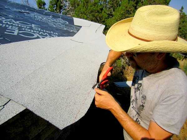 Además de cortar que el 8′ tiras más pequeñas para adaptarse, encontré que también debían insertar secciones pequeñas de teja en puntos al azar para añadir al patrón y ocultar clavos díscolos. Donde los extremos de las tejas vinieron juntos había recortado les que fueron redondeadas y los comprometidos para que el viento predominante no pela en una tormenta.