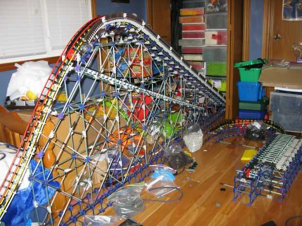 Usando imágenes reales del viaje, probar y recrear todo, desde los soportes y la pista en el equivalente de K'nex. Como una pauta que me gusta usar el 7-8 pista lazos (las piezas negras en las fotos) por la longitud de la barra de flexi. Usando este muchos ayudará a mantener la pista lisa.