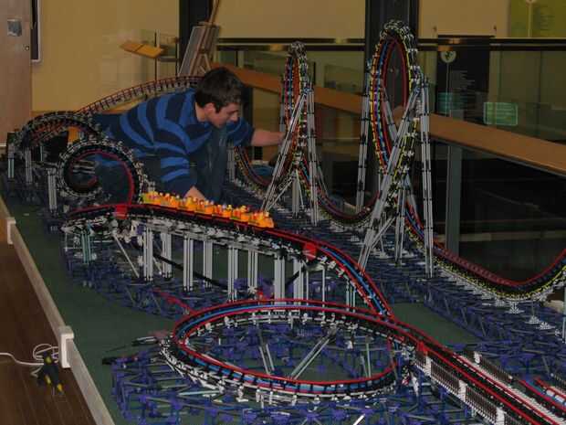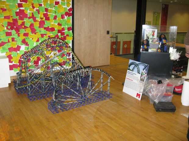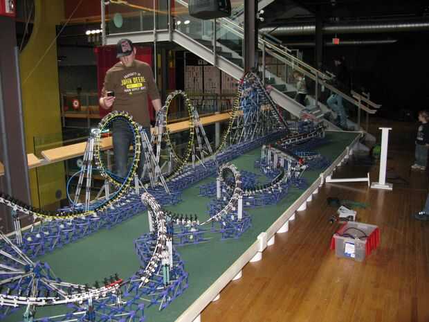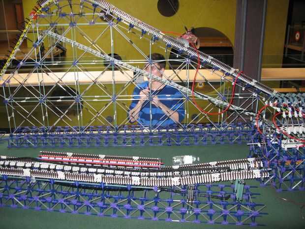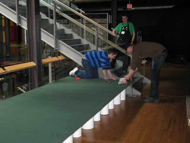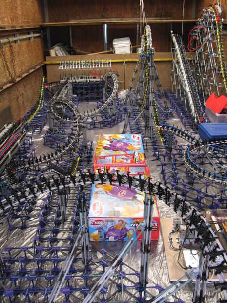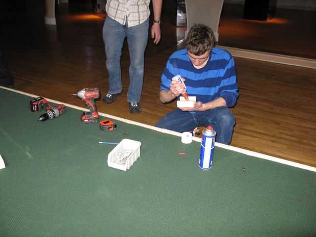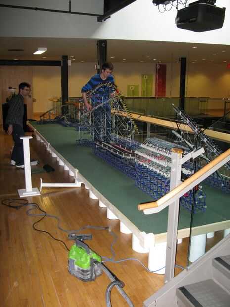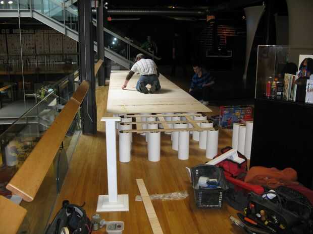 La base de la atracción se hizo de 7 láminas de madera contrachapada, sonotube (utiliza para hacer postes de concreto de los tubos) y verde alfombra. Resultó bien y era super resistente. General dimensiones eran aproximadamente 30 pies de largo x 6 pies de ancho x 4 pies de alto.