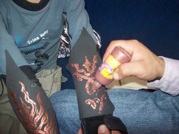 usaba armadura el año pasado de "Thor traje" de negra espumosa, buscalo en google alguna imagen de los dragones y dibujar diseños de algunos cool feroz con un producto para pintura de vidrio llamado: Vitraplom.