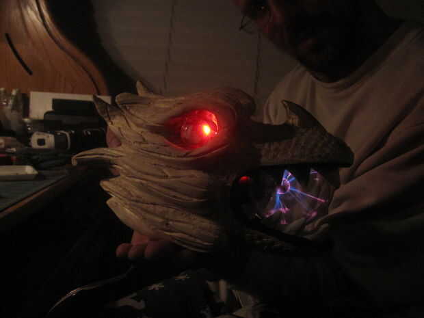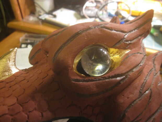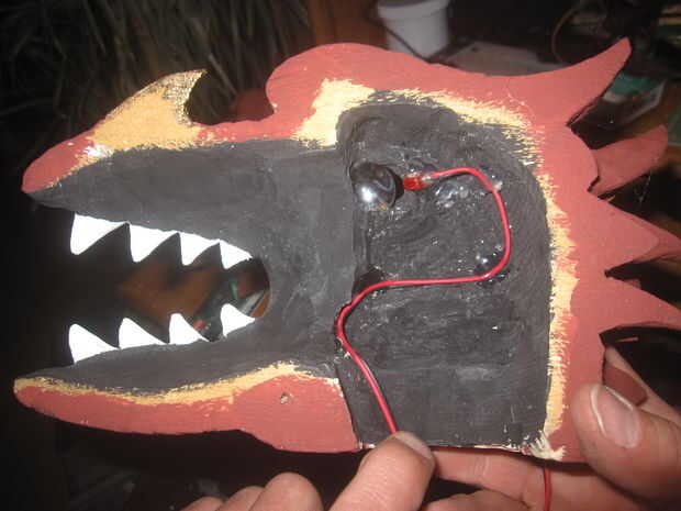Los ojos de caleidoscopio se sujeta con unos toques de pegamento caliente, y el altavoz y el LED rojo se coloca y luego sujeta con pegamento caliente, así.