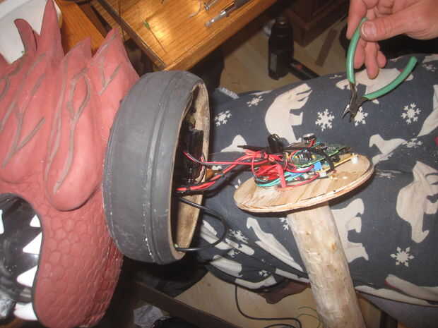 La cabeza del dragón era un poco demasiado pequeña para mantener todos los componentes electrónicos y baterías, por lo que optamos por hacer un pedestal de un bol teca vieja que tenía por ahí. El dragón estaba entonces montado sobre este pedestal.
