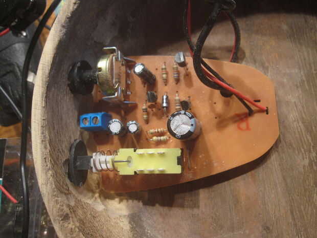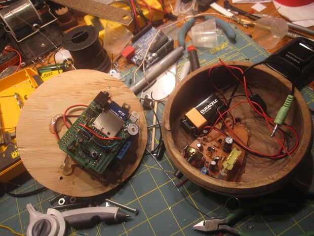 Nos robaron un circuito amplificador de un viejo par de altavoces de la computadora y cablear la alimentación al microcontrolador desde el mismo interruptor. Opté por correr 2 pilas de 9v debido a consideraciones de espacio, pero pilas de 9v son realmente débiles y como tales no eran la mejor opción. Si tienes el espacio, te sugiero tratar de AA o recargables.